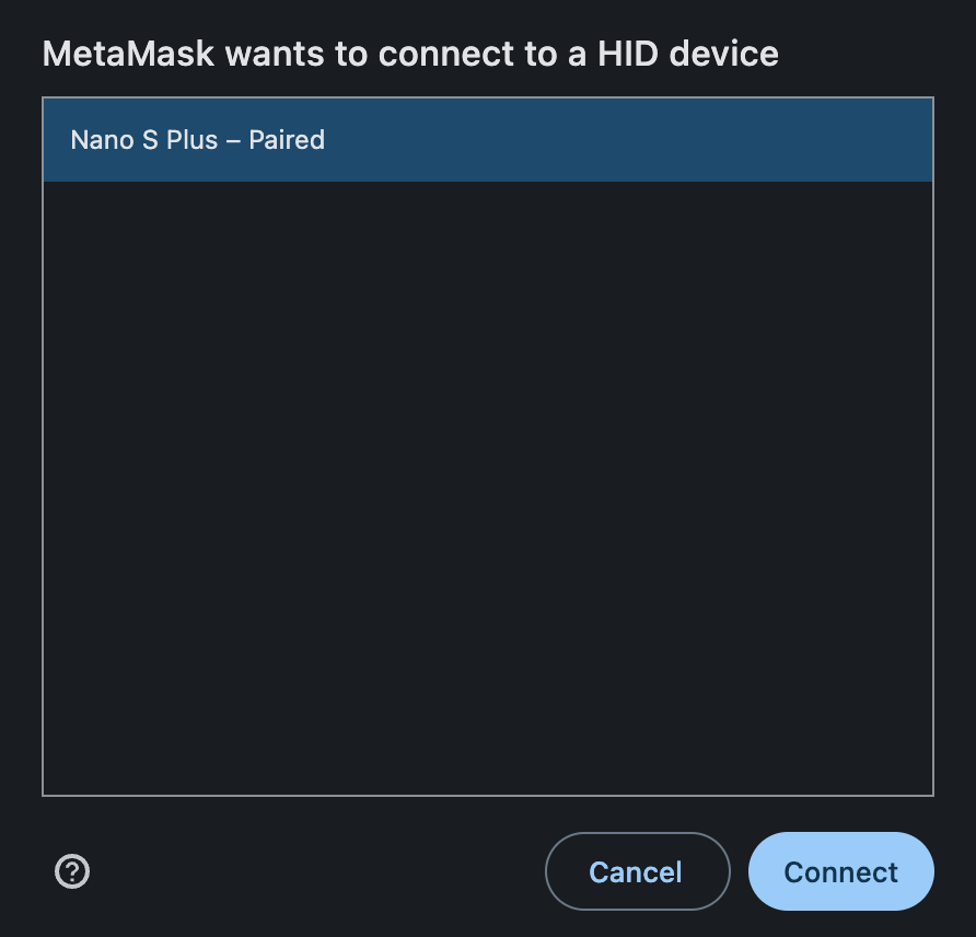 7. Press "Continue" in the browser, choose your ledger device in the window that pops up and press "Connect"