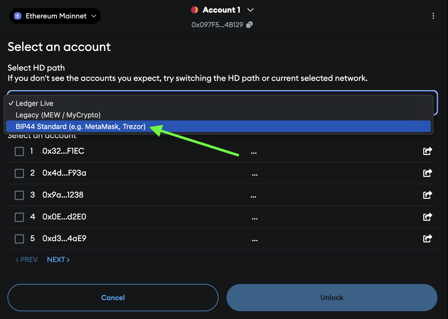 8. Press "Continue" and on the next page where it asks you to choose an HD path, select "BIP44 Standard (e.g. Metamask, Trezor)".