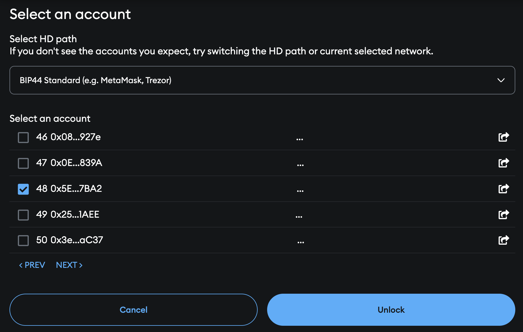 11. If it is a match, check account 48 and press "Unlock". You will now have access to any funds sent to this address from Metamask.