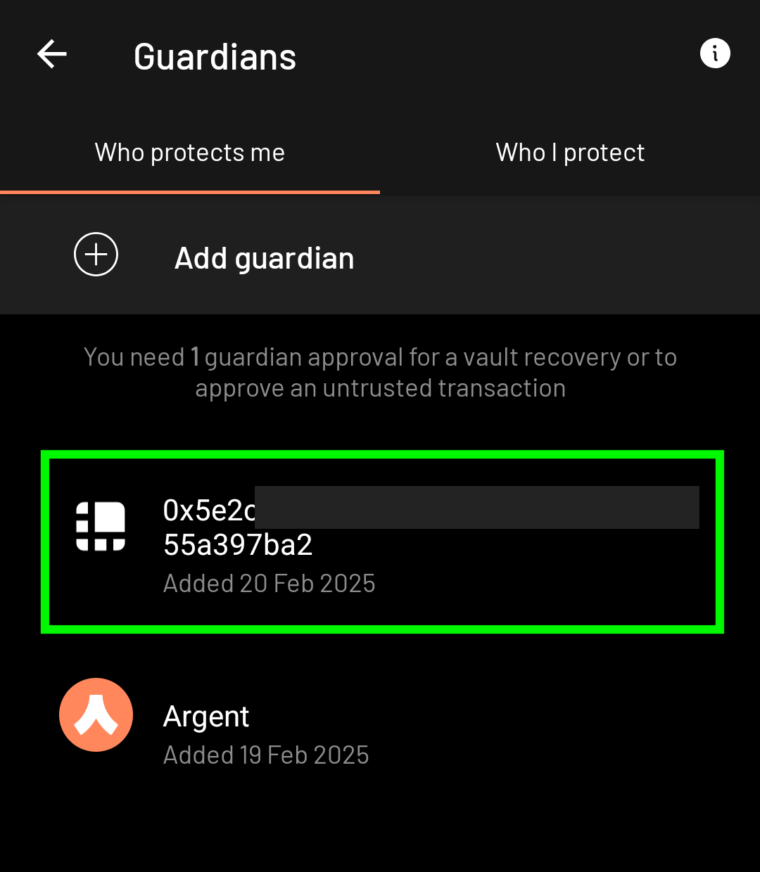 10. Check in Ready app that this is the same address as your guardian ledger. Open the mobile app and go to Settings > Wallet recovery > Review guardians to see the address.