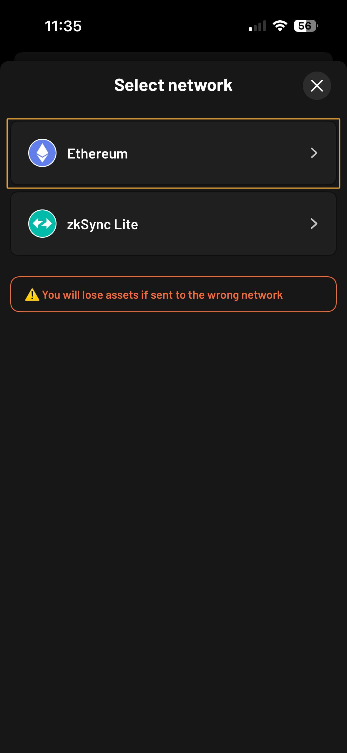 Seleccione Ethereum como la red receptora (¡no seleccione zkSync Lite!)