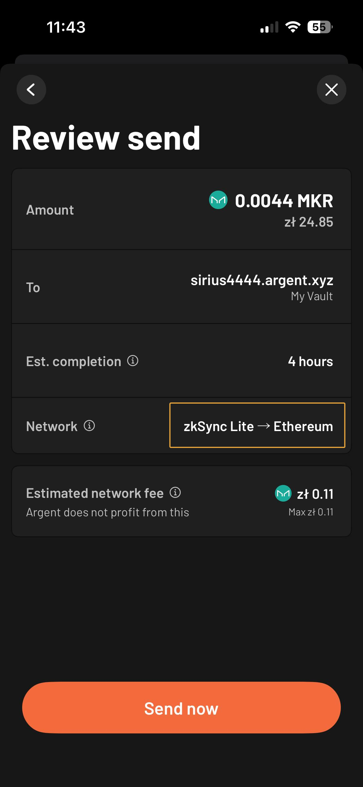 Recomendamos enviar sus activos a otra cuenta de Ethereum (como MetaMask o una billetera hardware) para evitar las tarifas de red más altas asociadas con Argent Ethereum Vault. Solo envíe activos a su Argent Ethereum Vault como último recurso.
